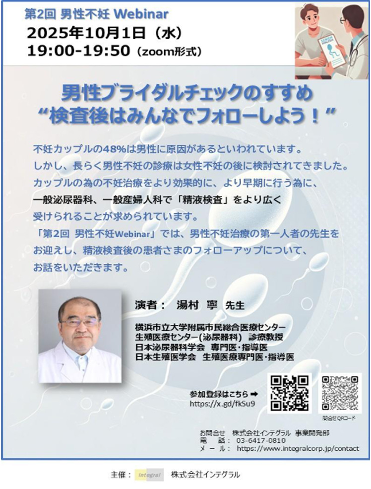 2025年10月1日(水)に【第2回 男性不妊Webinar】を開催いたします!後日、アーカイブ視聴もできます。一般泌尿器科、一般産婦人科のみなさま、この機会に是非、ご登録ください。お待ちしております!